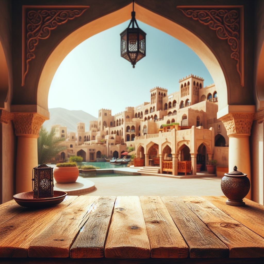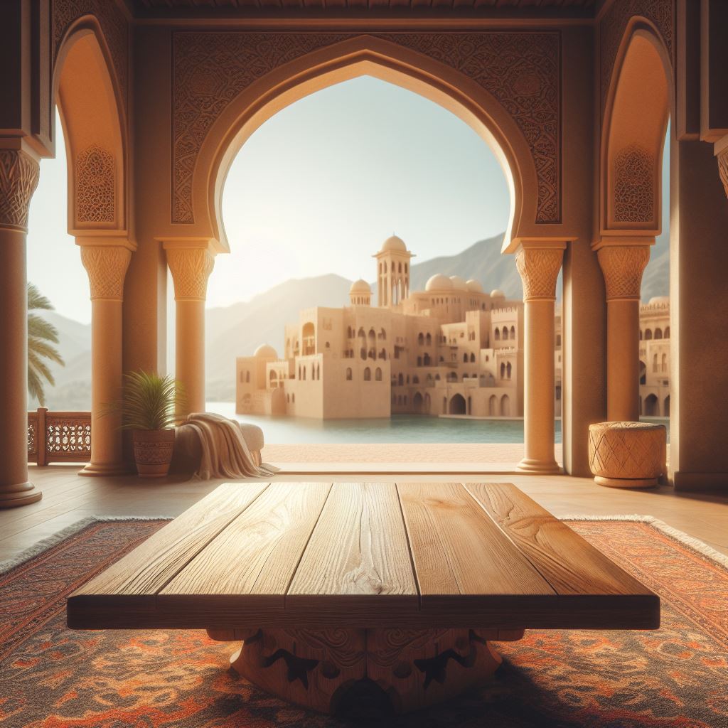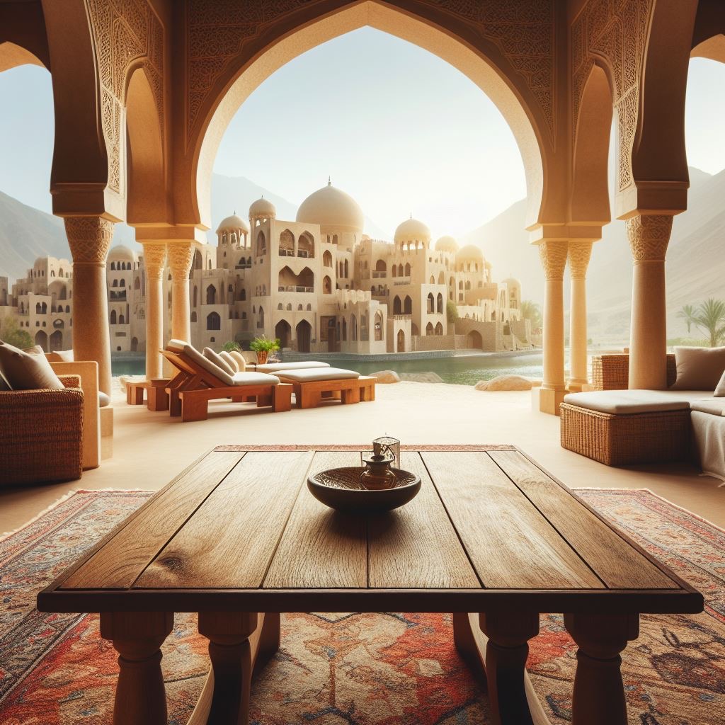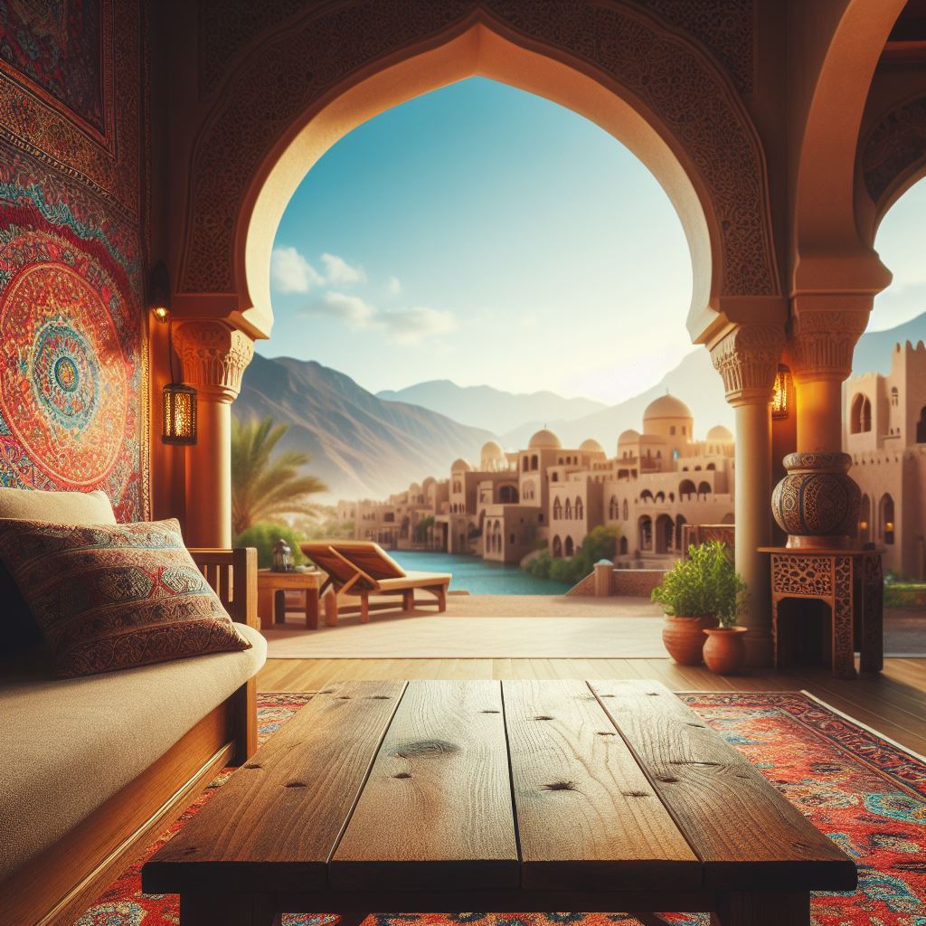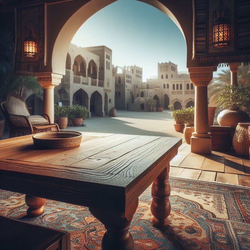 close up wooden table in front under arch, carpet in corner, arab village at background,