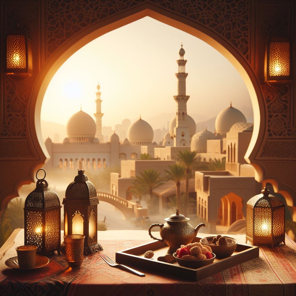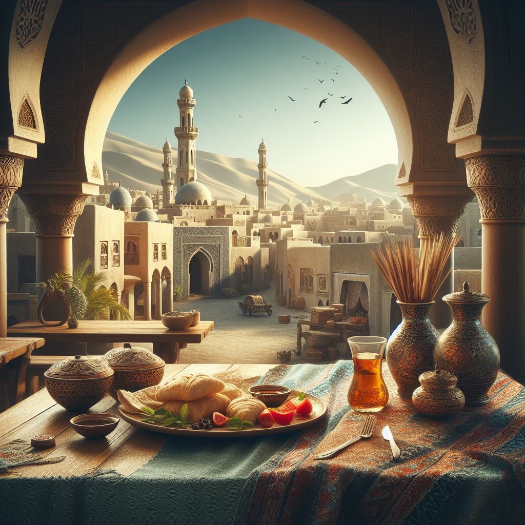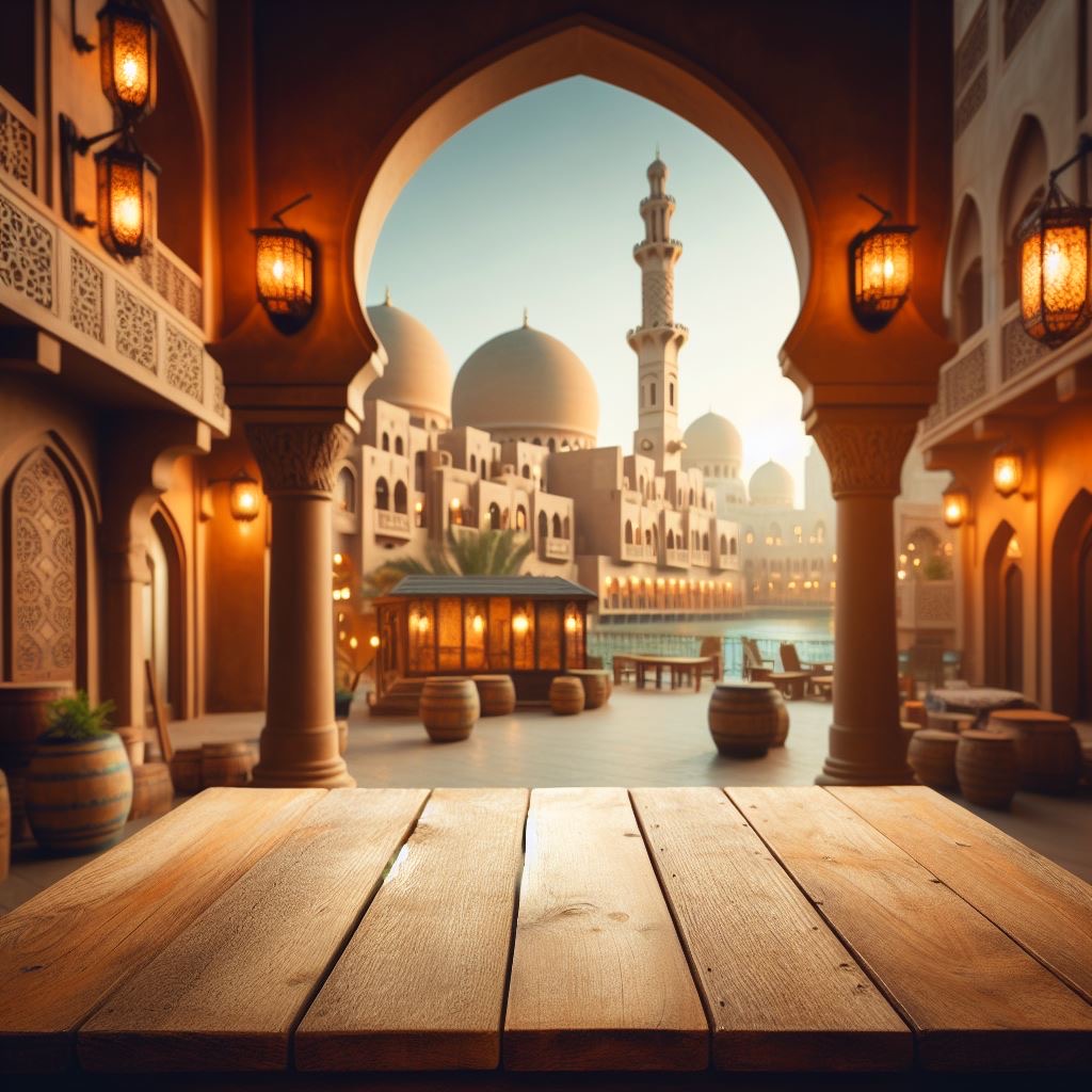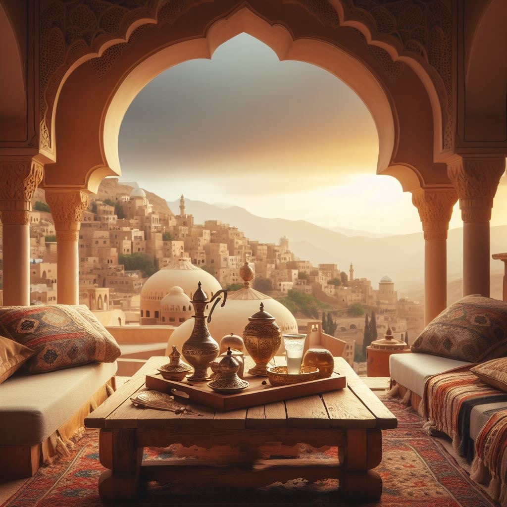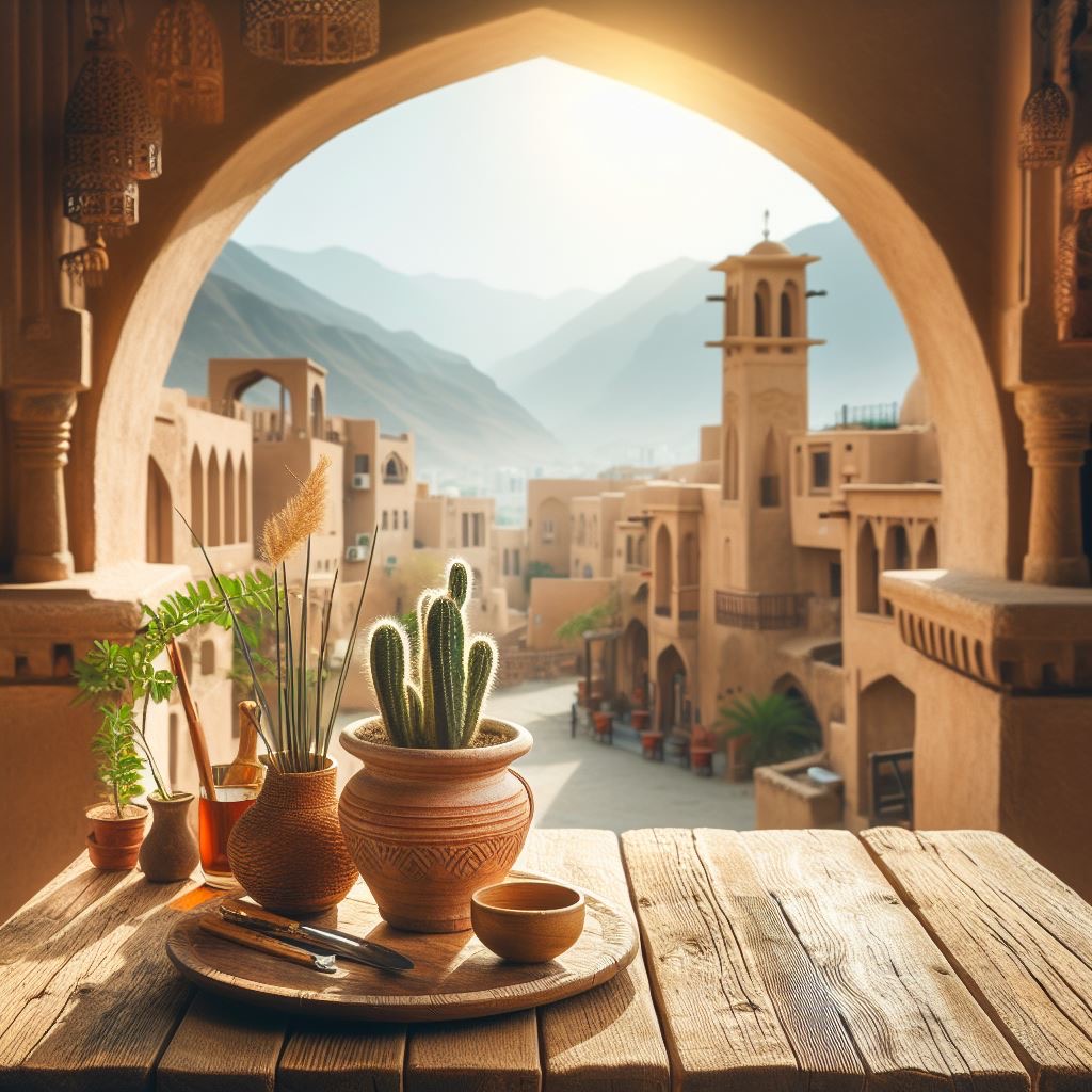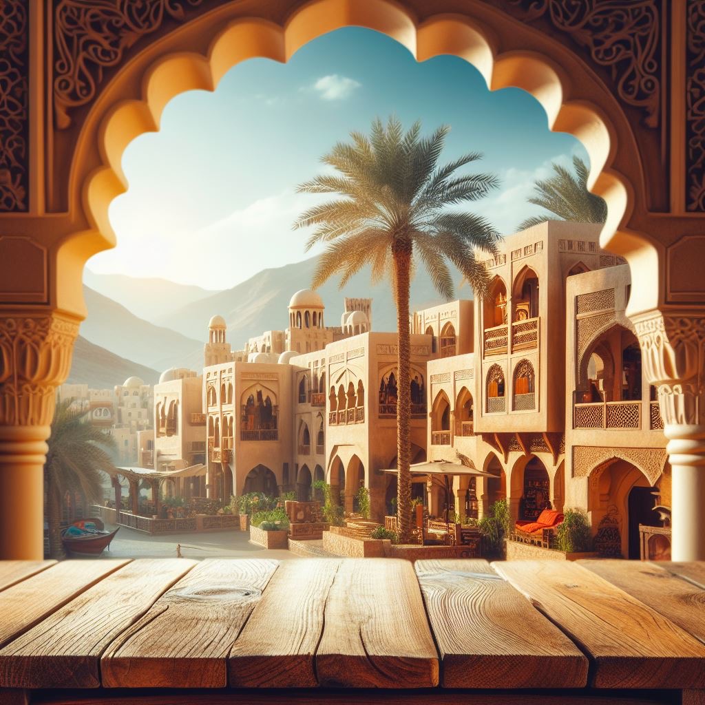 close up wooden table in front under arch, carpet in corner, arab village at background,