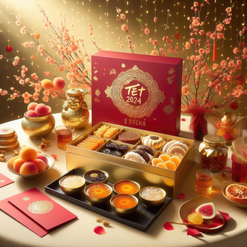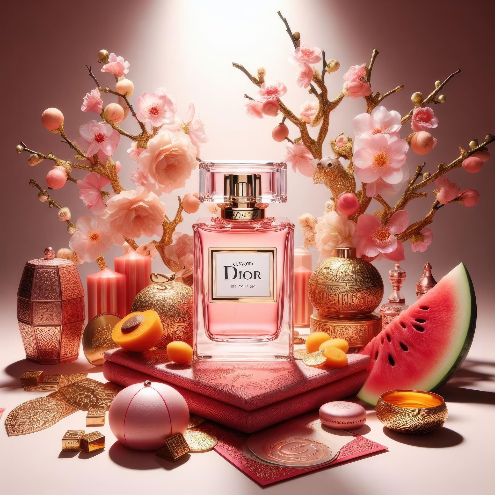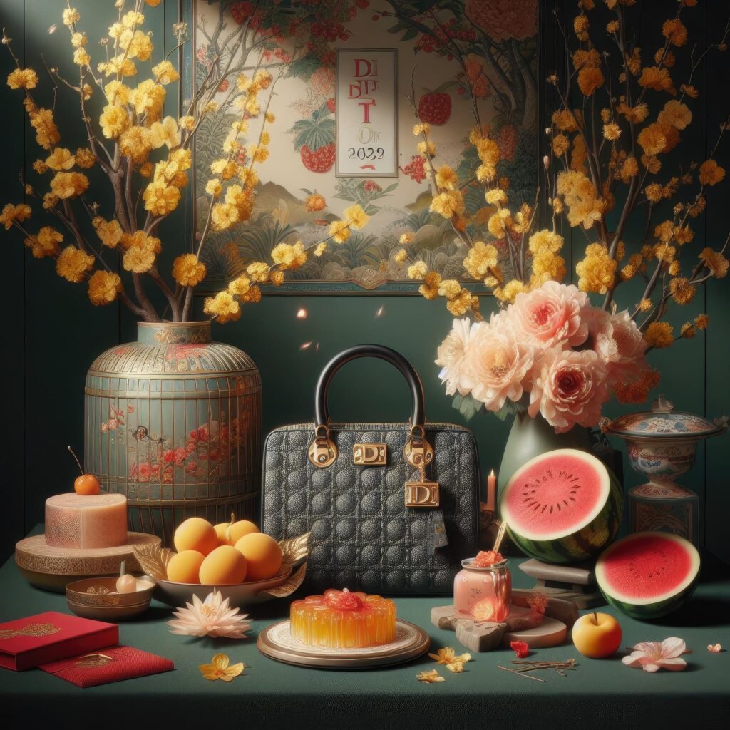 Dior handbags, chiếu sáng nổi bật trên nền Tết Việt Nam, phong cách quảng cáo sang trọng. Nền gồm yếu tố Tết truyền thống: cây mai vàng, cành đào, bánh mứt, quả dưa hấu, bao lì xì đỏ, sắp đặt tinh tế. Ánh sáng tập trung vào chủ thể, làm điểm nhấn, chi tiết rõ ràng. Slogan ‘TET 2024’ bên ngoài, phông chữ truyền thống và hoa văn Tết. Bố cục tái hiện quảng cáo chất lượng, kết hợp văn hóa và thương hiệu.