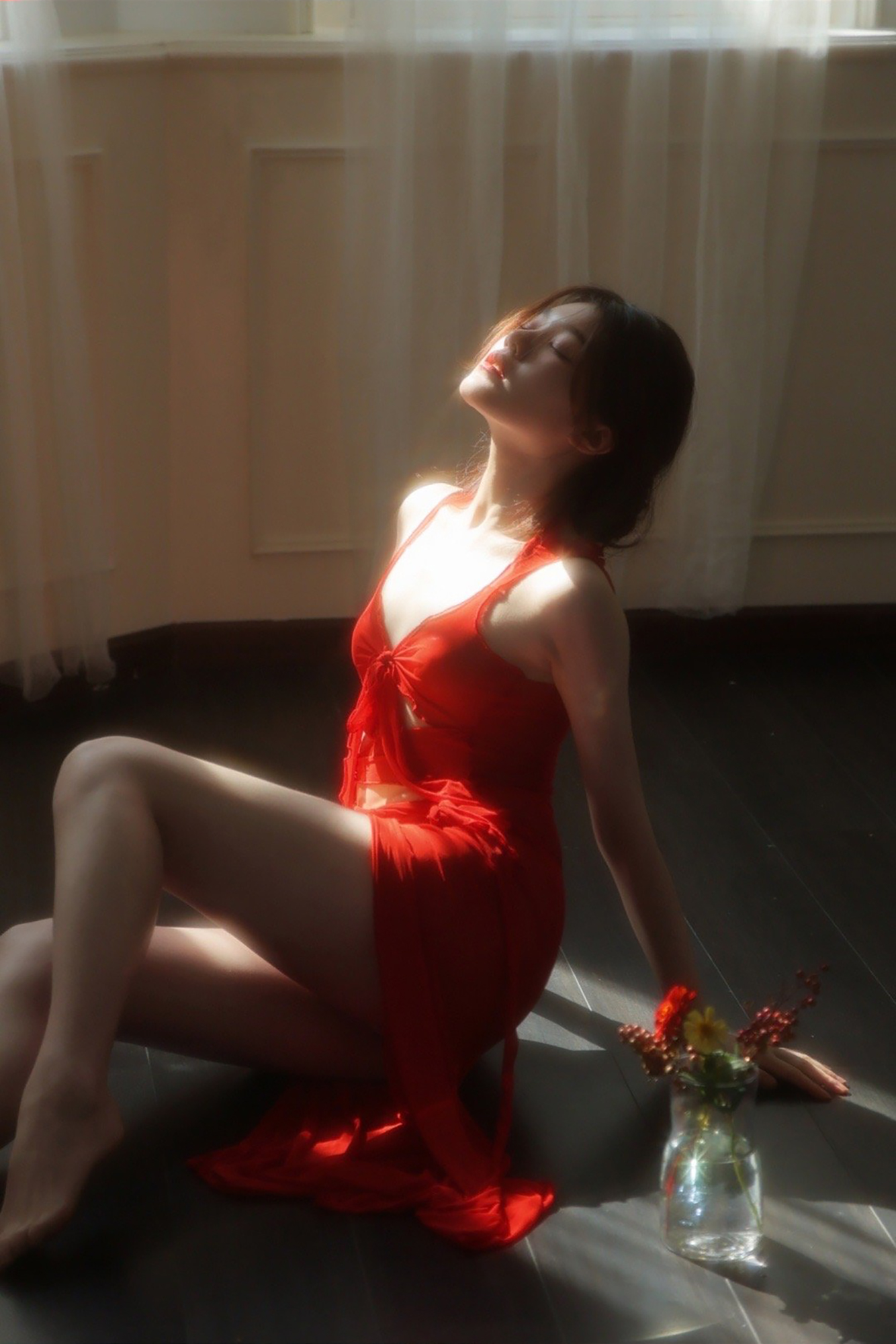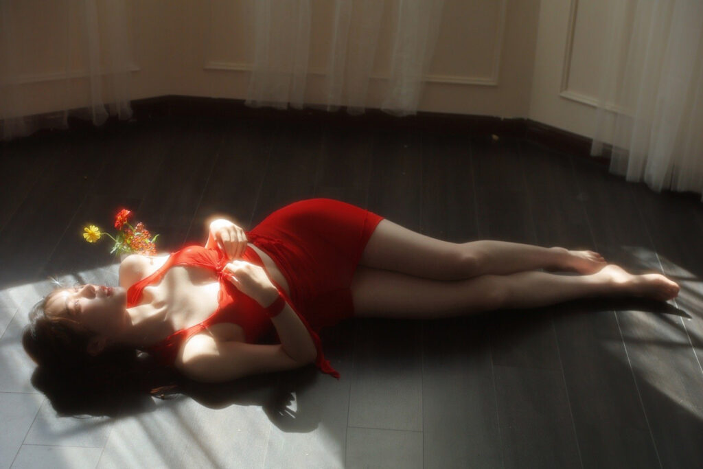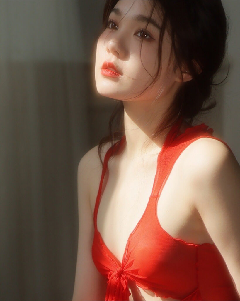 Đây là một trong những bộ ảnh chân dung gợi cảm đầy đủ góc, miêu tả được thần thái của mẫu. Khai thác tối đa ánh sáng tự nhiên. Mẫu trang điểm màu môi đỏ đậm cùng tone với váy áo nổi bật trên bối cảnh nền tối.