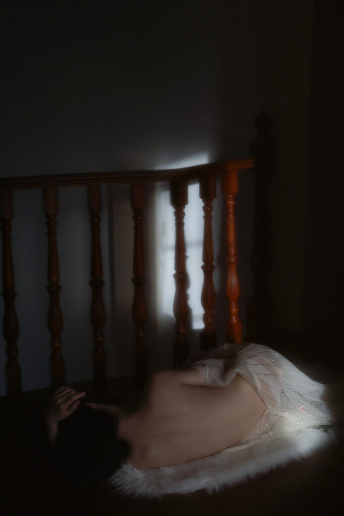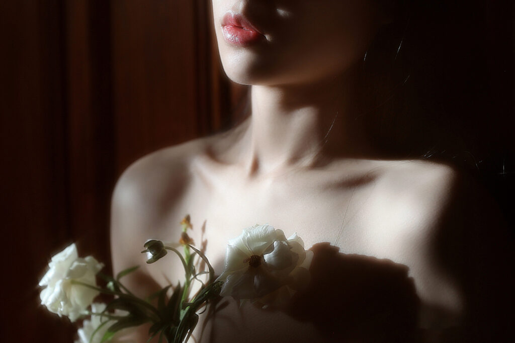 Cô dâu trong trang phục váy cưới đơn giản kéo trễ vai lộ cả vòng eo, stylish khéo léo tạo dáng để không quá phô ra vòng 1. Bộ ảnh nhấn chủ yếu đường cong eo và vai lung trần với diễn xuất chiều sâu nội tâm của cô dâu cho ngày trọng đại.