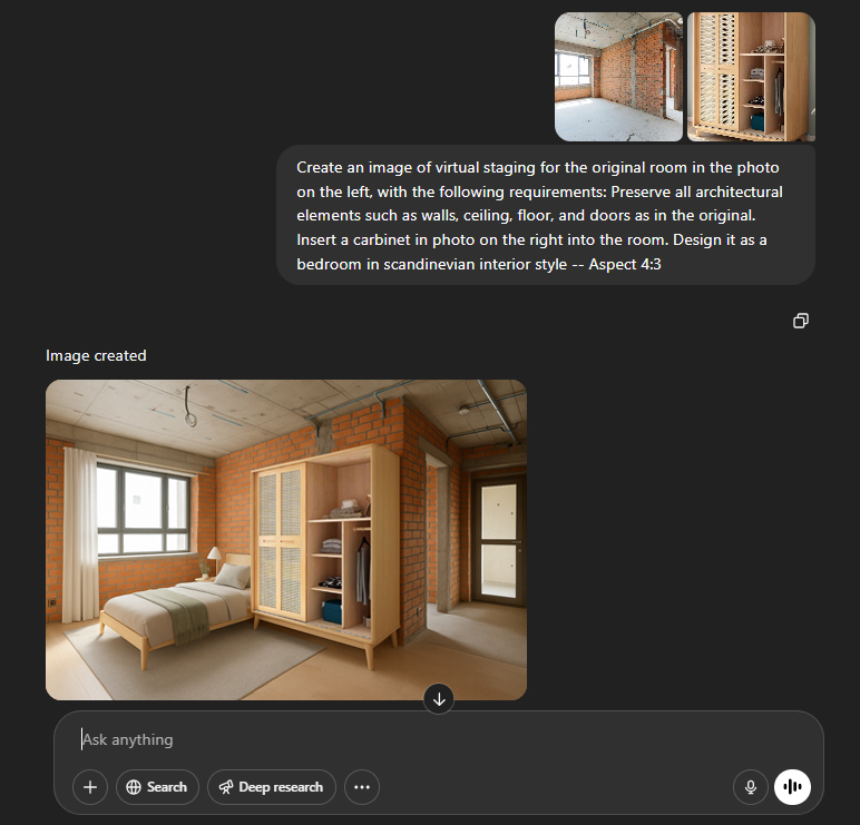 Key Visual đã có bài hướng dẫn Trang trí Nội thất theo Phong cách mong muốn với đồ Nội thất "Ngẫu nhiên". Trong bài này Key Visual hướng dẫn lên ý tưởng Thiết kế Nội thất với đồ nội thất sẵn có như: Tủ, Ghế, Bàn … tất cả bố trí trong không gian nhà bạn. Chỉ với ứng dụng ChatGPT, không cài đặt, không cần máy khủng.