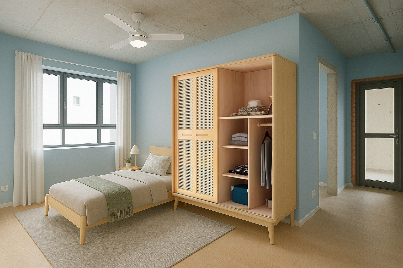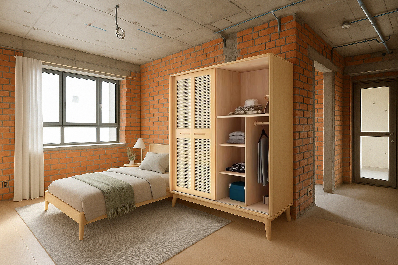 Create an image of virtual staging for the original room in the photo on the left, with the following requirements: Preserve all architectural elements such as walls, ceiling, floor, and doors as in the original. Insert a carbinet in photo on the right into the room. Design it as a bedroom in scandinevian interior style — Aspect 4:3