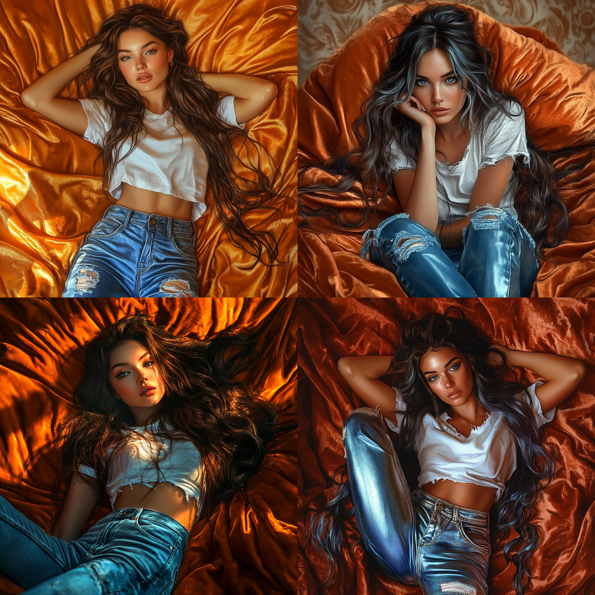 a photorealistic image of an attractive woman with long messy hair that brunette with pale blue highlights. She posing for a fashion magazine cover. She is wearing metallic blue jeans and a white ripped T-shirt . She is laying on a bed with an orange velvet duvet. the photo is suitable for a high end fashion magazine.