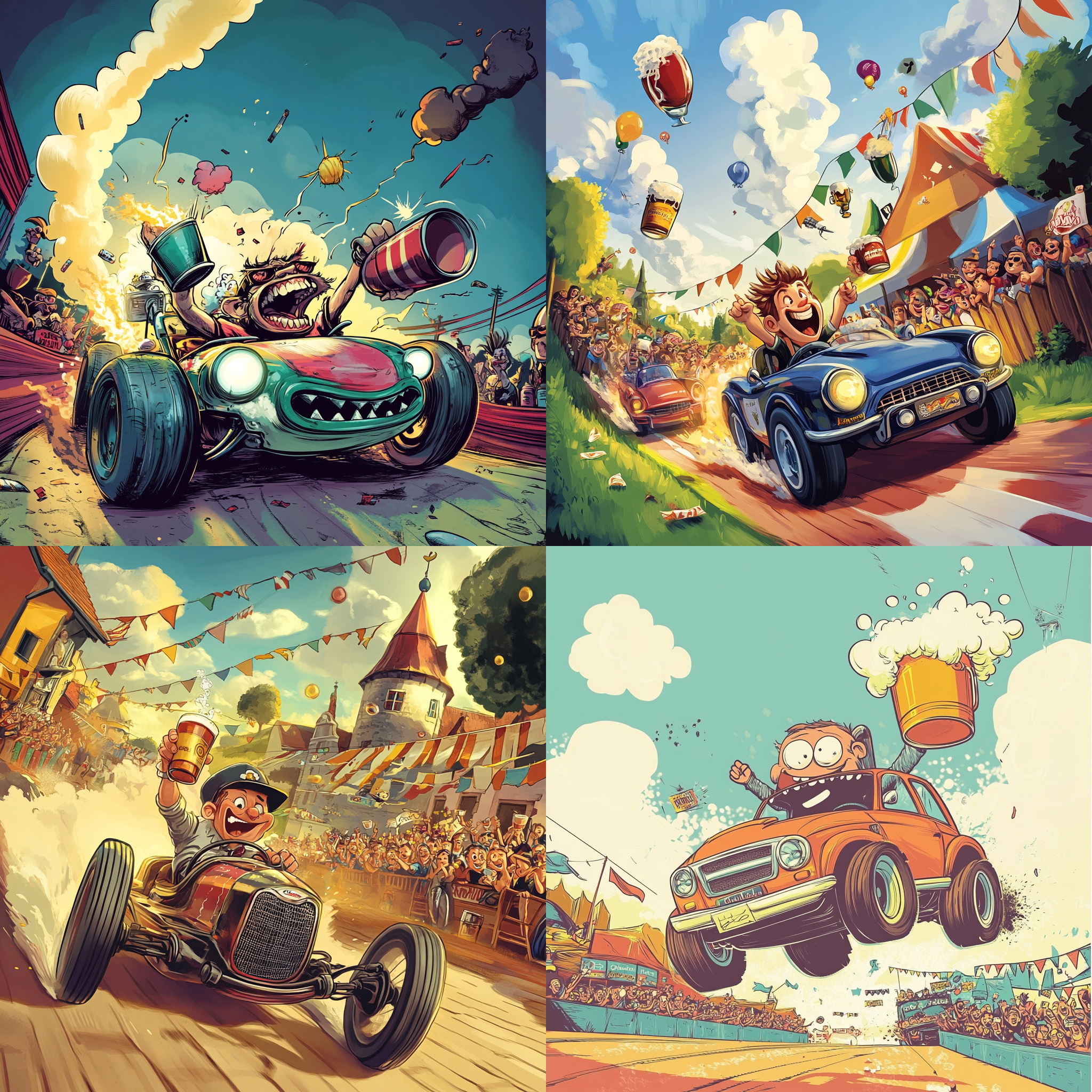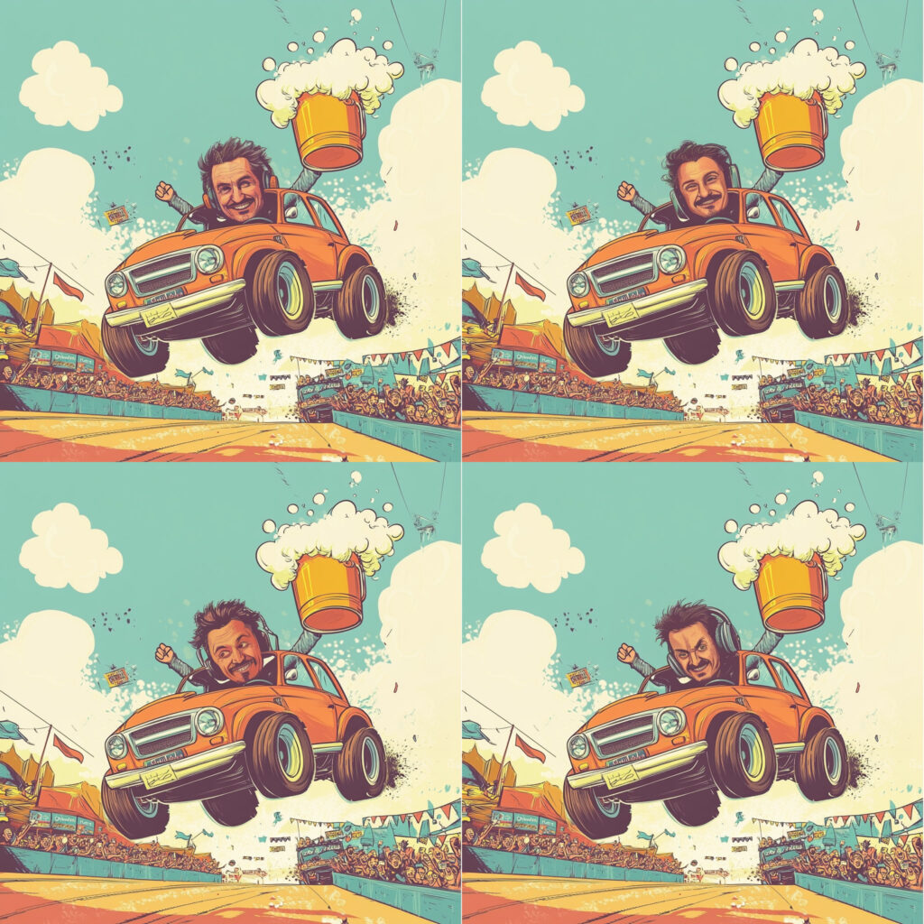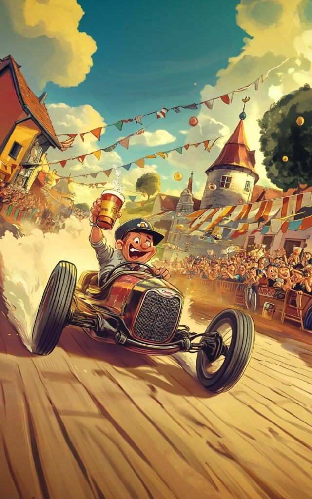 A vibrant cartoon cover depicting a humorous mix of racing and beer celebration. A stylized cartoon-style racing car races around a race track while giant beer mugs stand like obstacles on the side. The driver, a happy cartoon character in a party hat, holds a beer mug while cheering. In the background, cartoon characters are partying hard, waving beer mugs and dancing under colorful party lights. The sky is brightly colored and everything exudes an energetic, fun atmosphere.