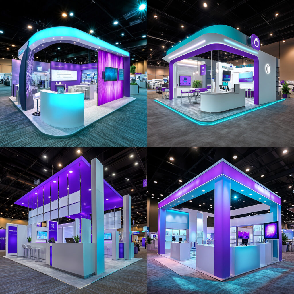 a big convention booth for pharmaceuticals that is high tech and professional, purple and teal, that is a straight on view of the front