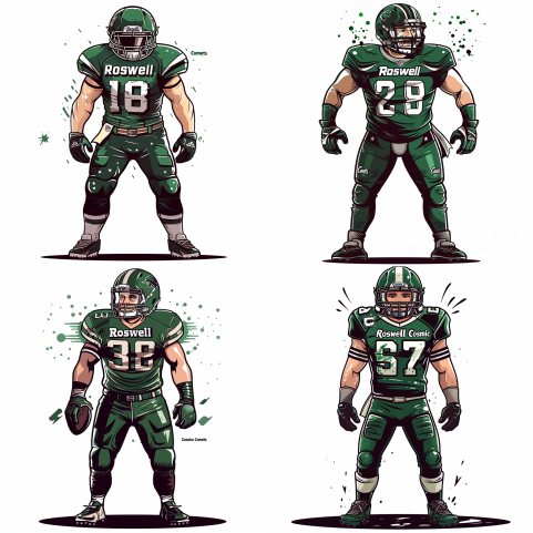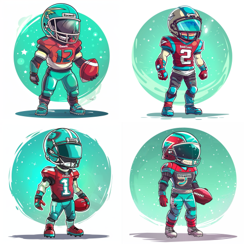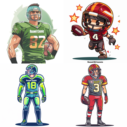 isolated Football Player character representing the “Roswell Cosmic Comets”, full body, minimalistic, cartoon portrait, bold rounded outlines, animated gifs
