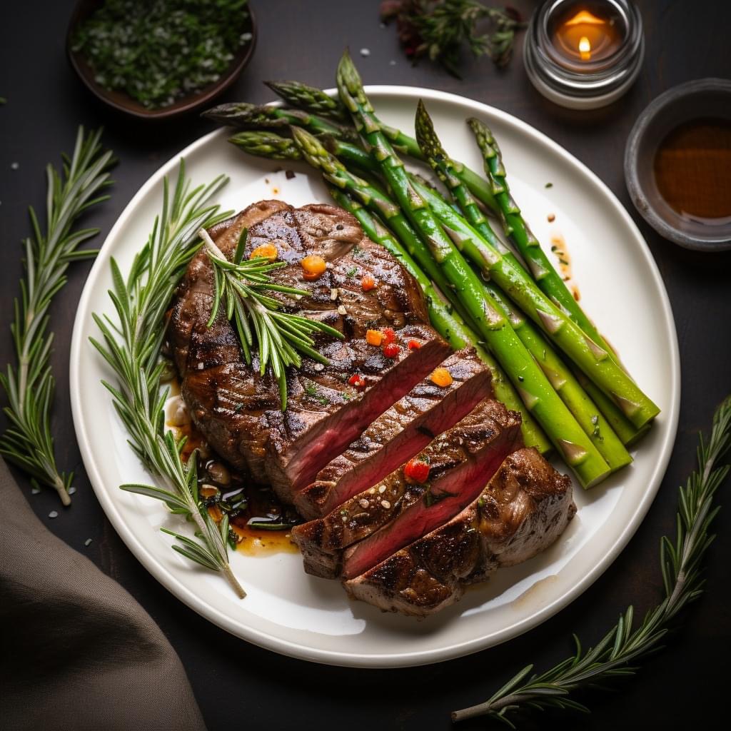 sirloin steak on a plate with asparagus, flat lay photography –s 250