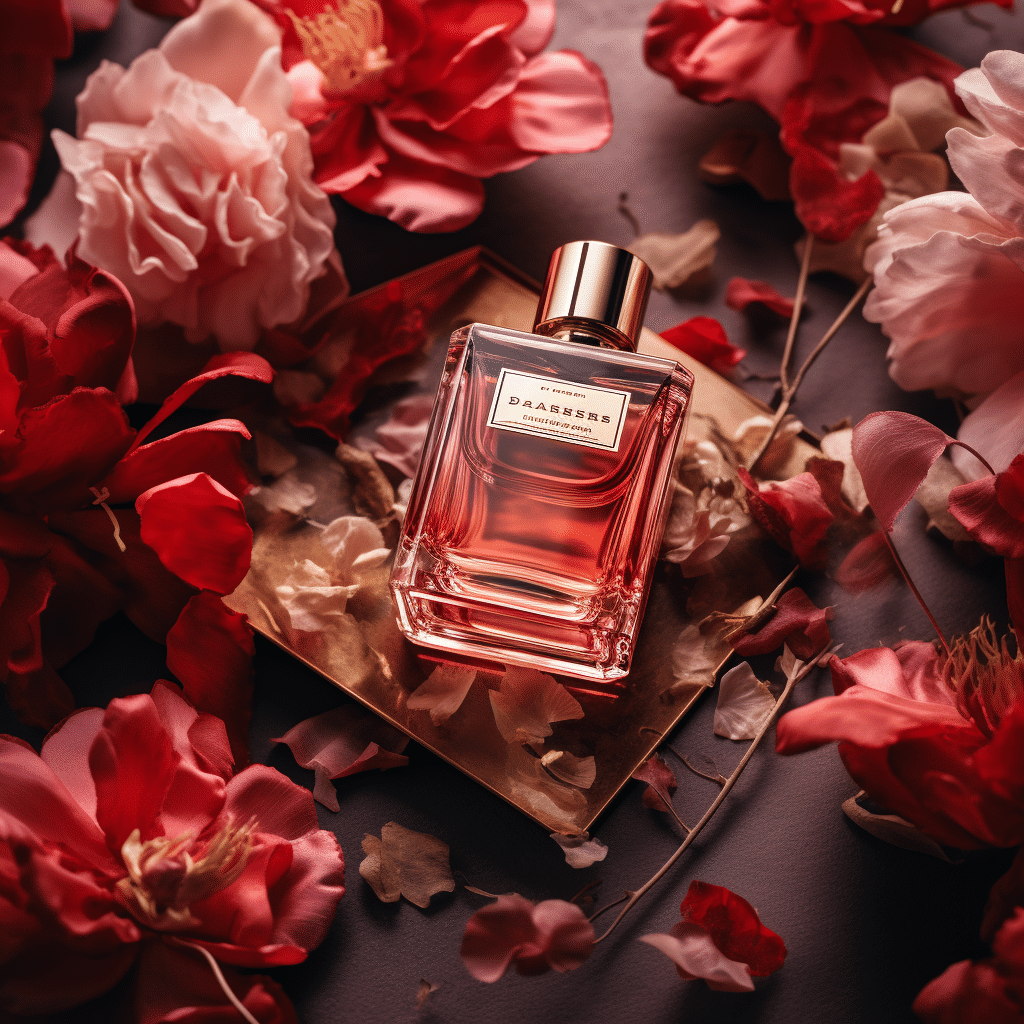 High-end Perfume in the style of a Shopify flatlay product shot layout, hero image