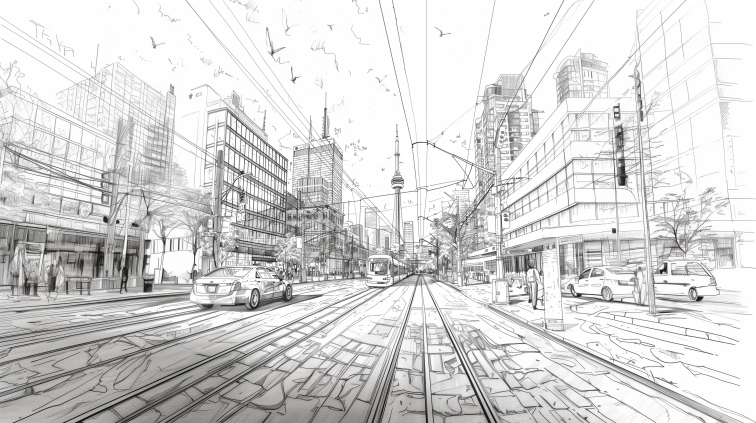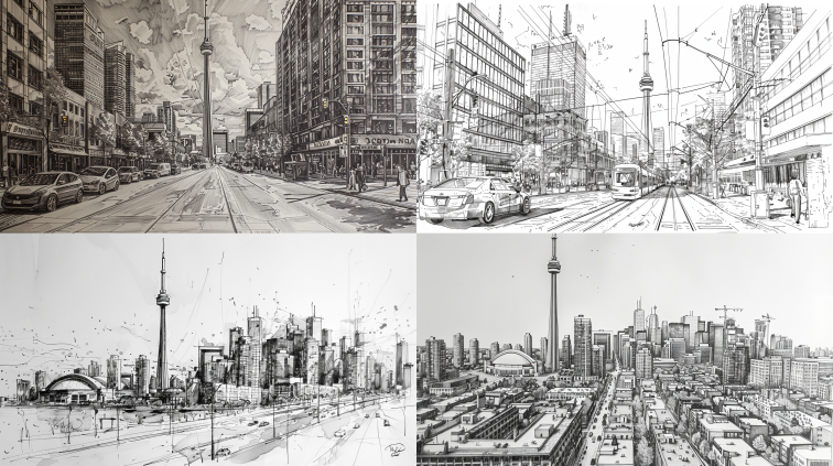 hand scetch of downtown toronto dandas yonge area and show CN tower as well. use pen strocks. –ar 16:9 –v 6.0
