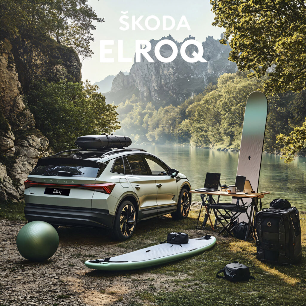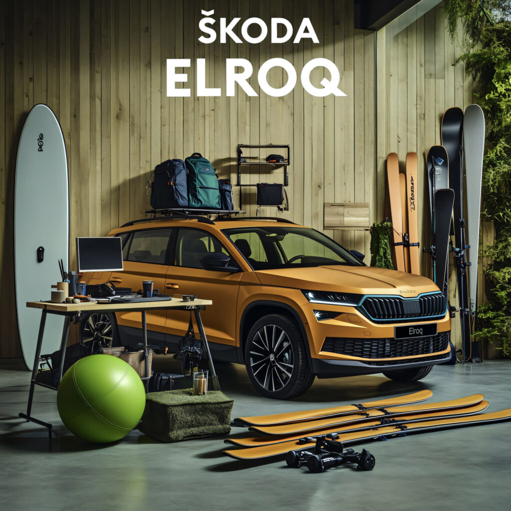 High-quality image of the Škoda Elroq electric SUV parked showroom. Around the car, place a large fitness ball, a tall hiking backpack, a paddleboard leaning against the car, a compact folding bicycle, a pair of skis, a foldable table with matching chairs, large suitcases, and a desktop computer. The items should be neatly arranged around the car to show its versatility and spaciousness, with a backdrop of nature and a soft light highlighting the details. The image should be realistic and vibrant, showcasing the Elroq’s sleek, modern design.