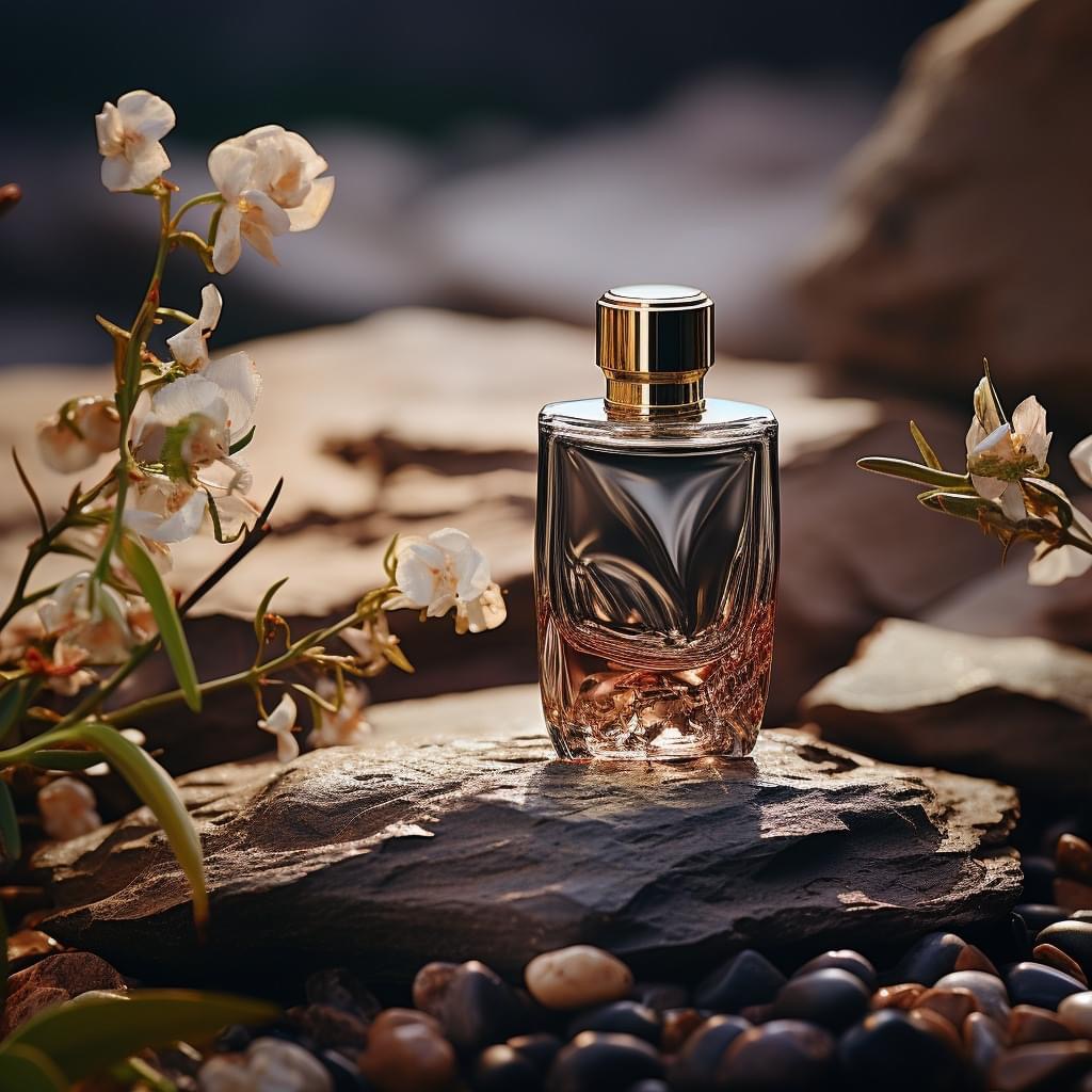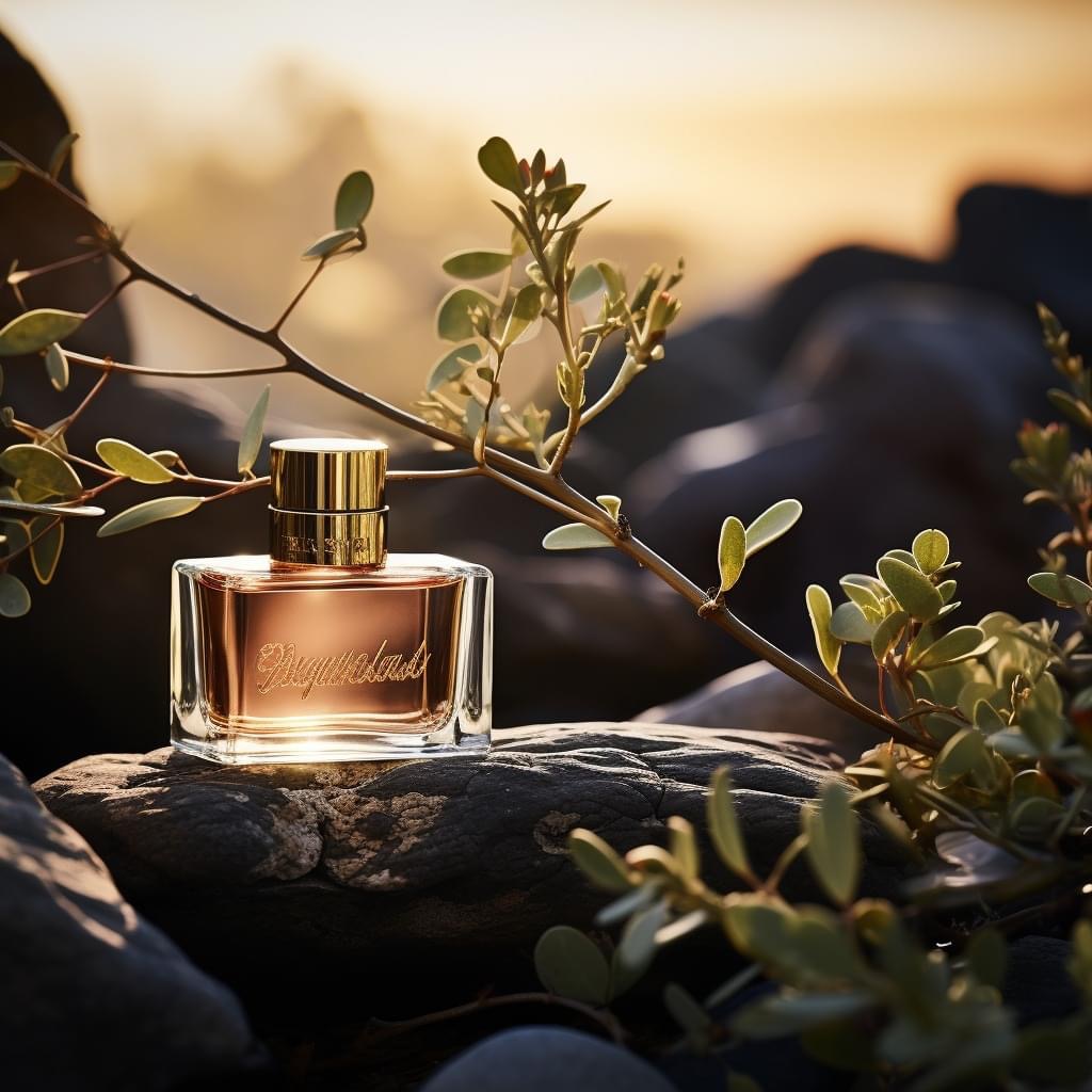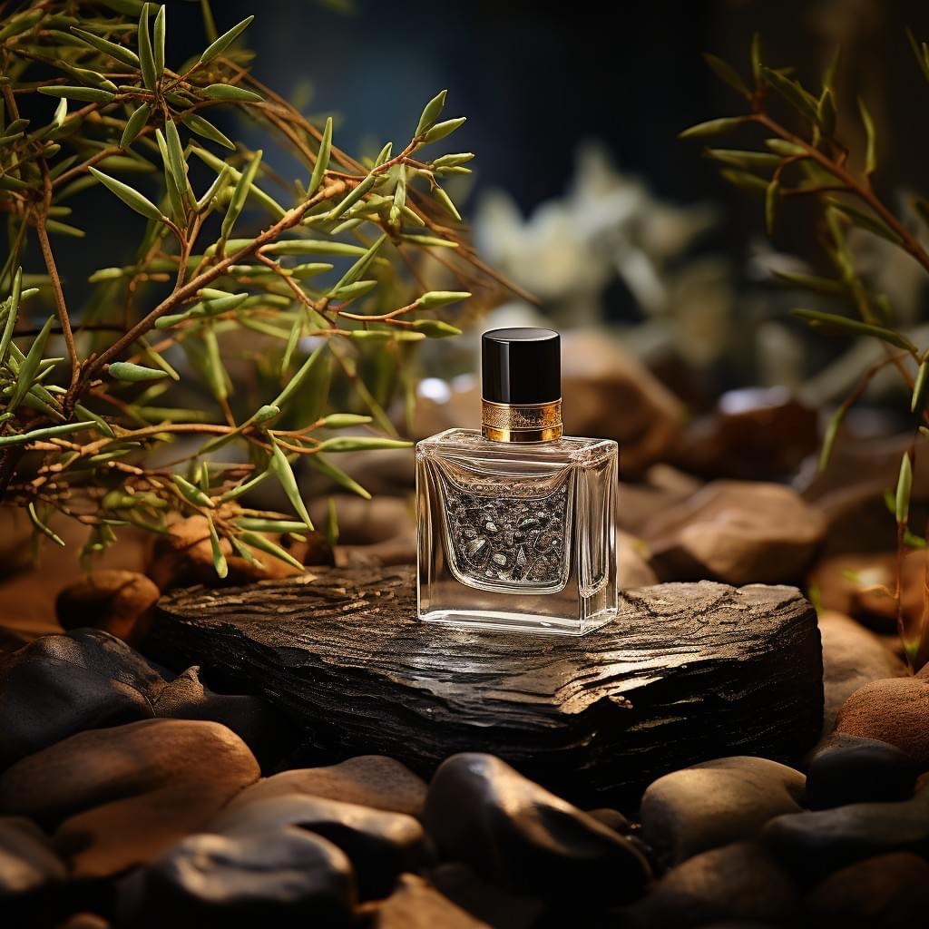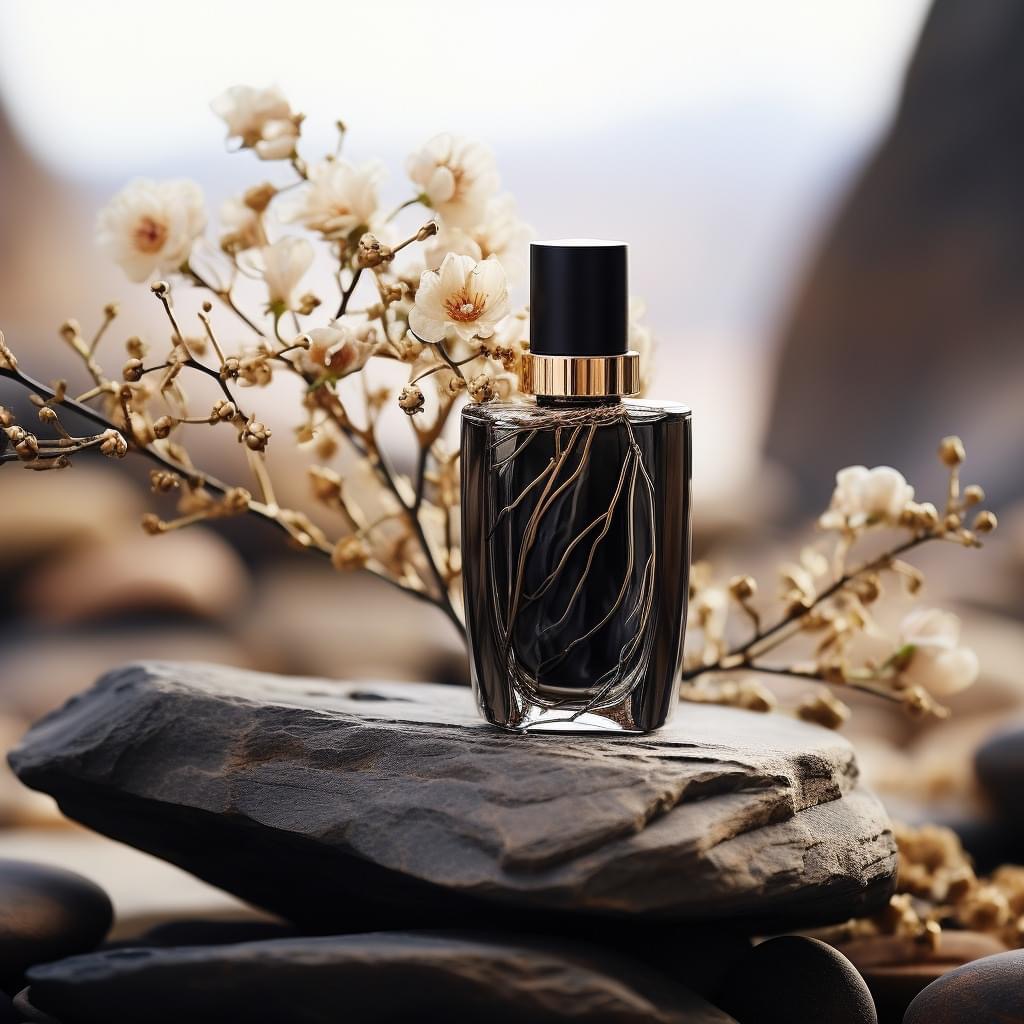 Photography, beautiful luxury black bottle of perfume with golden cap on polished rocks, thin branches of plants in the background, shallow depth of field, off white setting, peaceful environment, Studio lighting –iw 1 –s 250 –v 5.2