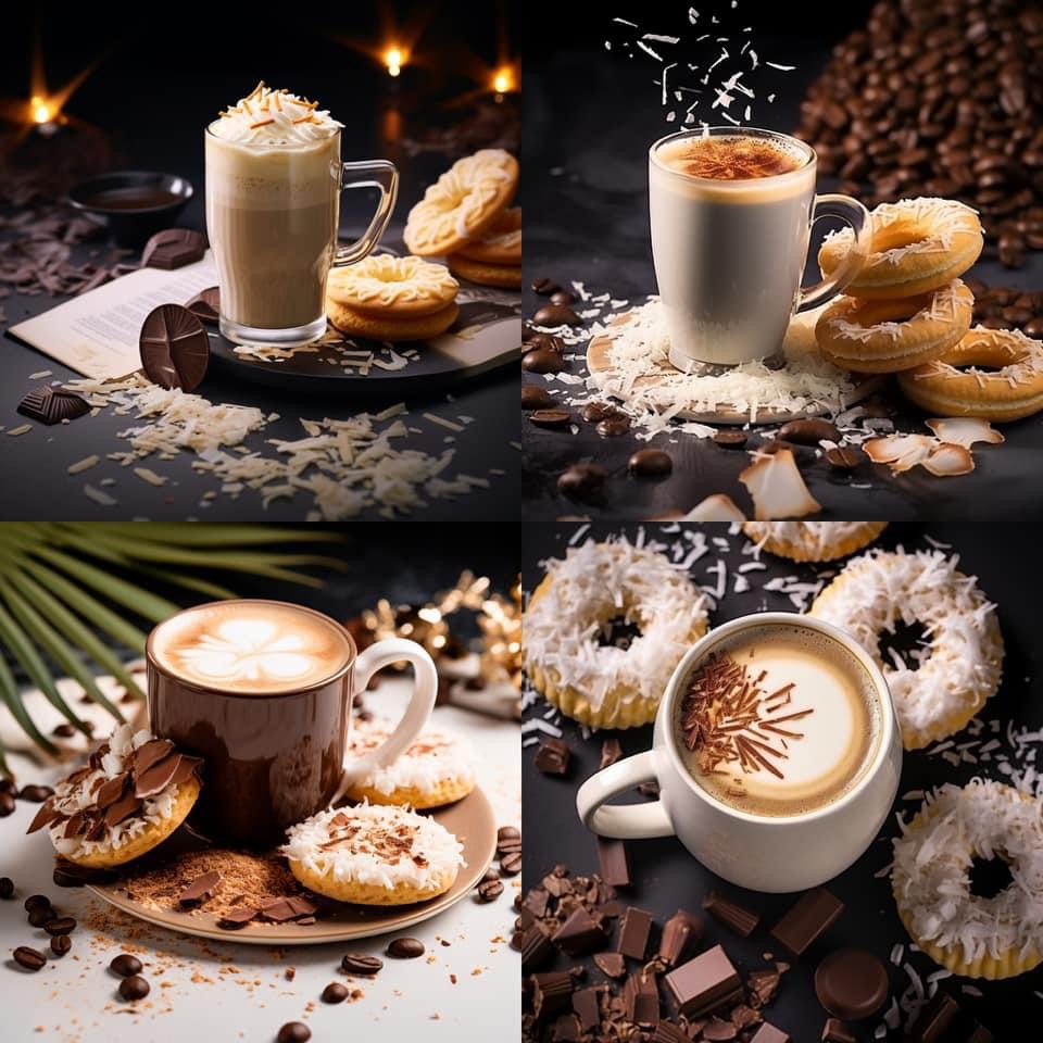 Starbucks latte, surrounded by ring-shaped cookies with chocolate, coconut shavings, Studio lighting, magazine photography –style raw –s 50