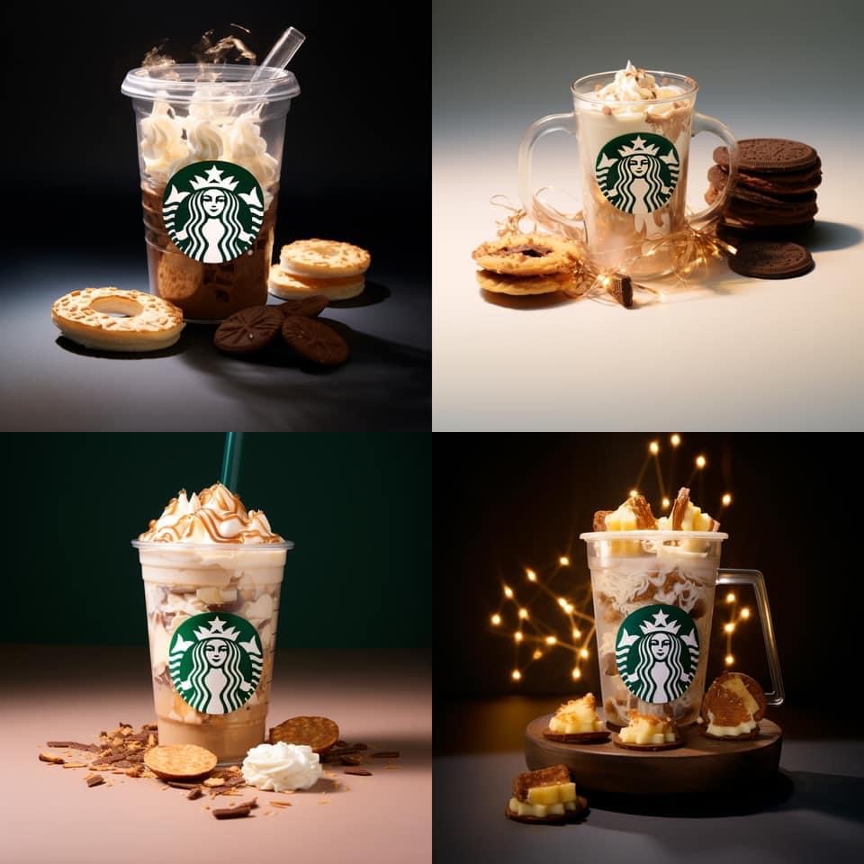 Transparent Starbucks cup, surrounded by ring-shaped cookies with chocolate, coconut shavings, Studio lighting, magazine photography –style raw –s 50