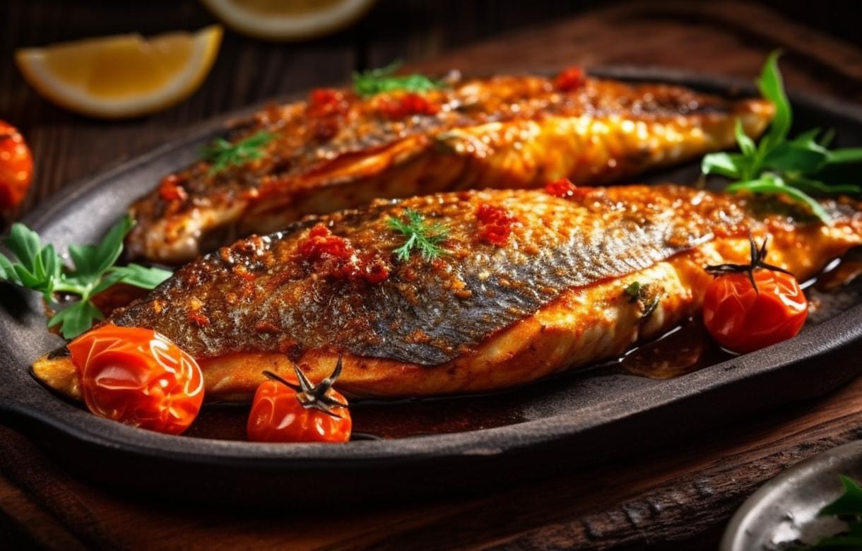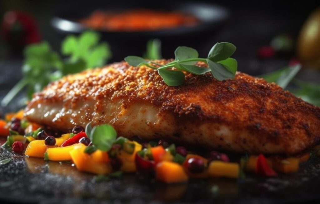 Photo for the recipe for Spicy tilapia fillet, soft-focus, richly layered, stockphoto, 8k –ar 725:362 –v 5 –s 750 –q 2