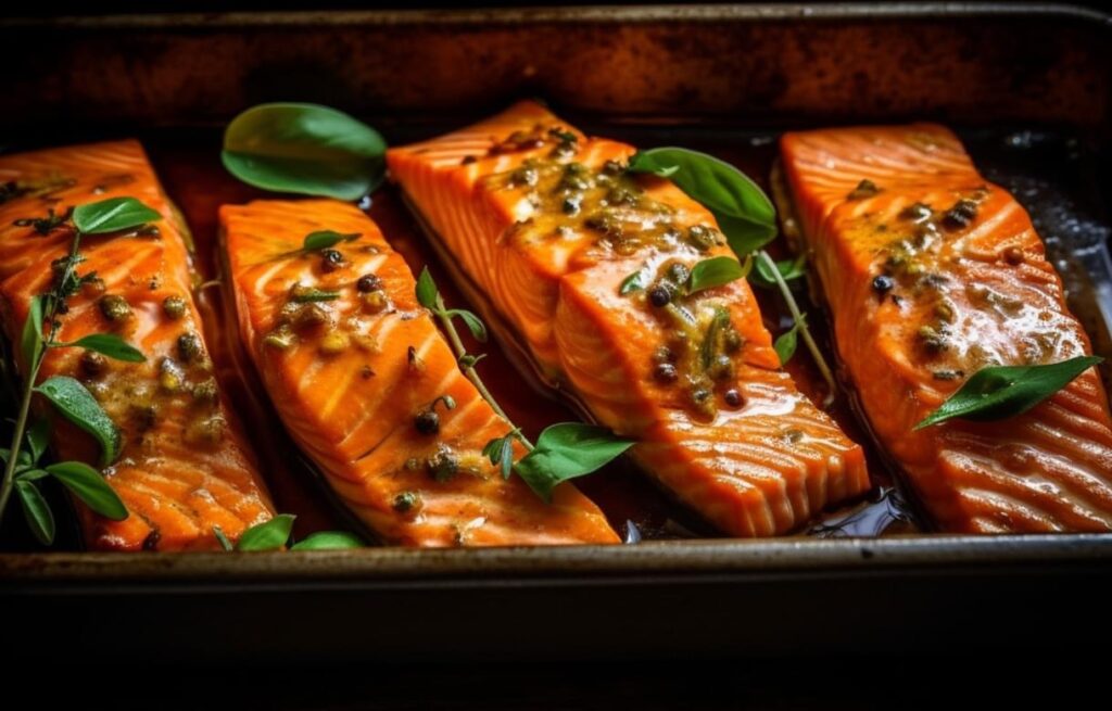 Photo for the recipe for salmon fillet in the oven, soft-focus, richly layered, stockphoto, 8k –ar 725:362 –v 5 –s 750 –q 2