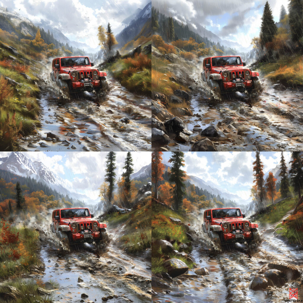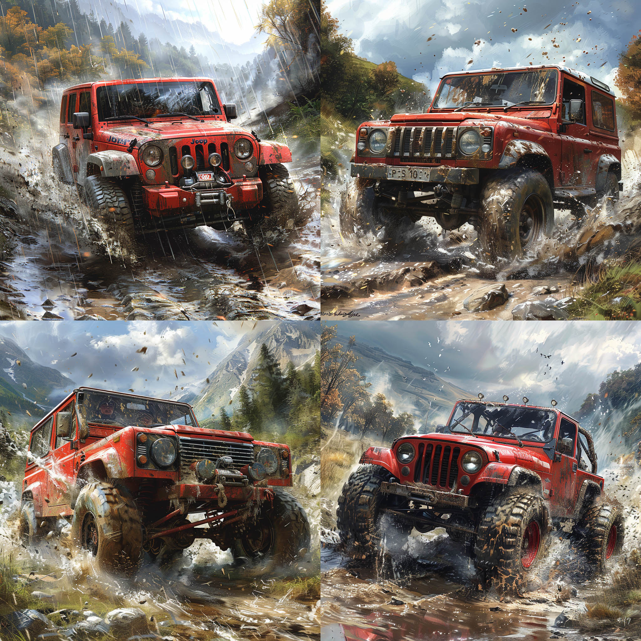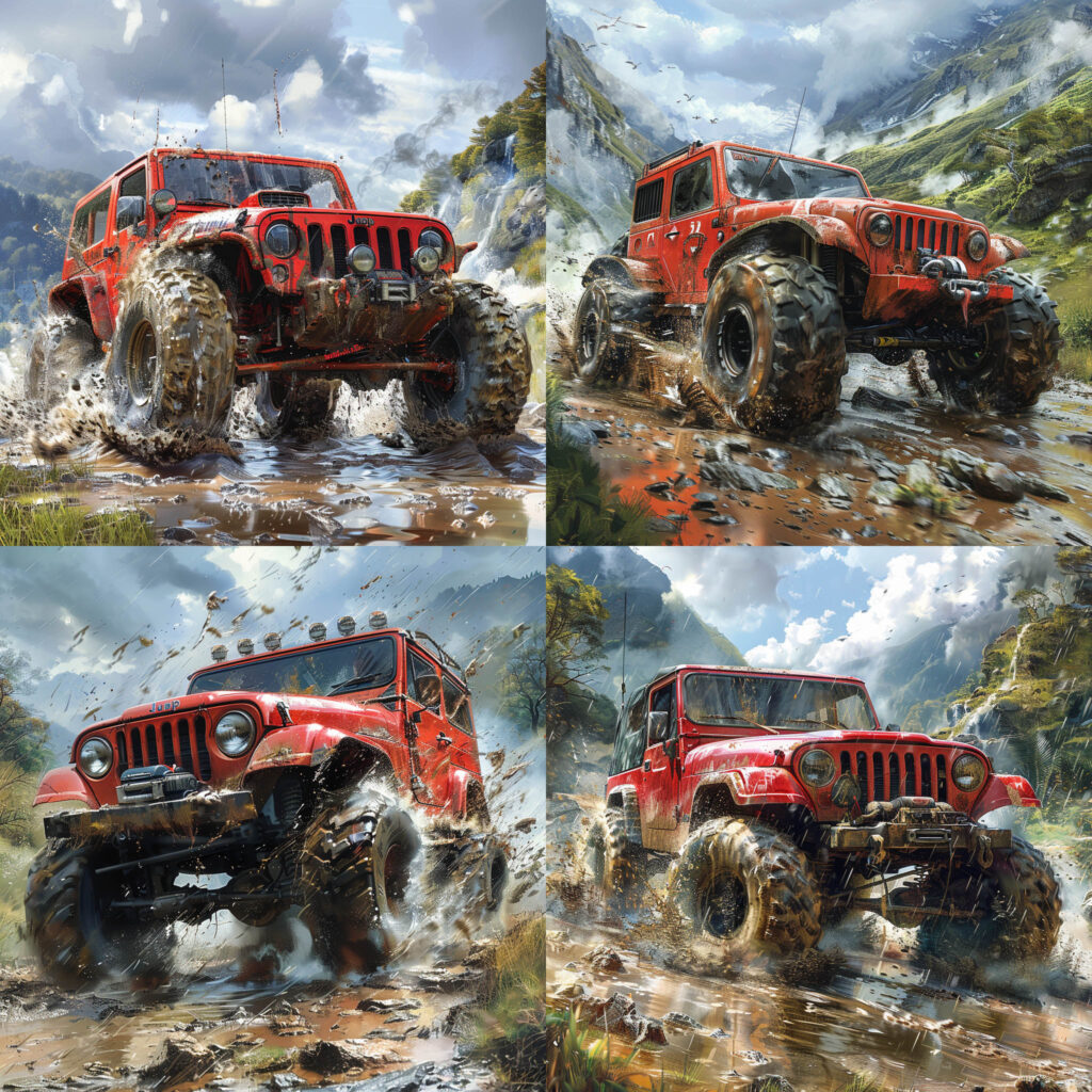 The image depicts a red off-road vehicle driving on a muddy terrain. The vehicle has large, chunky tires suitable for rough surfaces and appears to be in motion, as suggested by the splash of mud around its wheels. There is no visible driver inside the car, which adds an element of mystery or adventure to the scene. The background shows a natural landscape with greenery and hills, indicating that this might be a rural or remote area. The overall impression is one of outdoor exploration or possibly off-road racing. –s 750