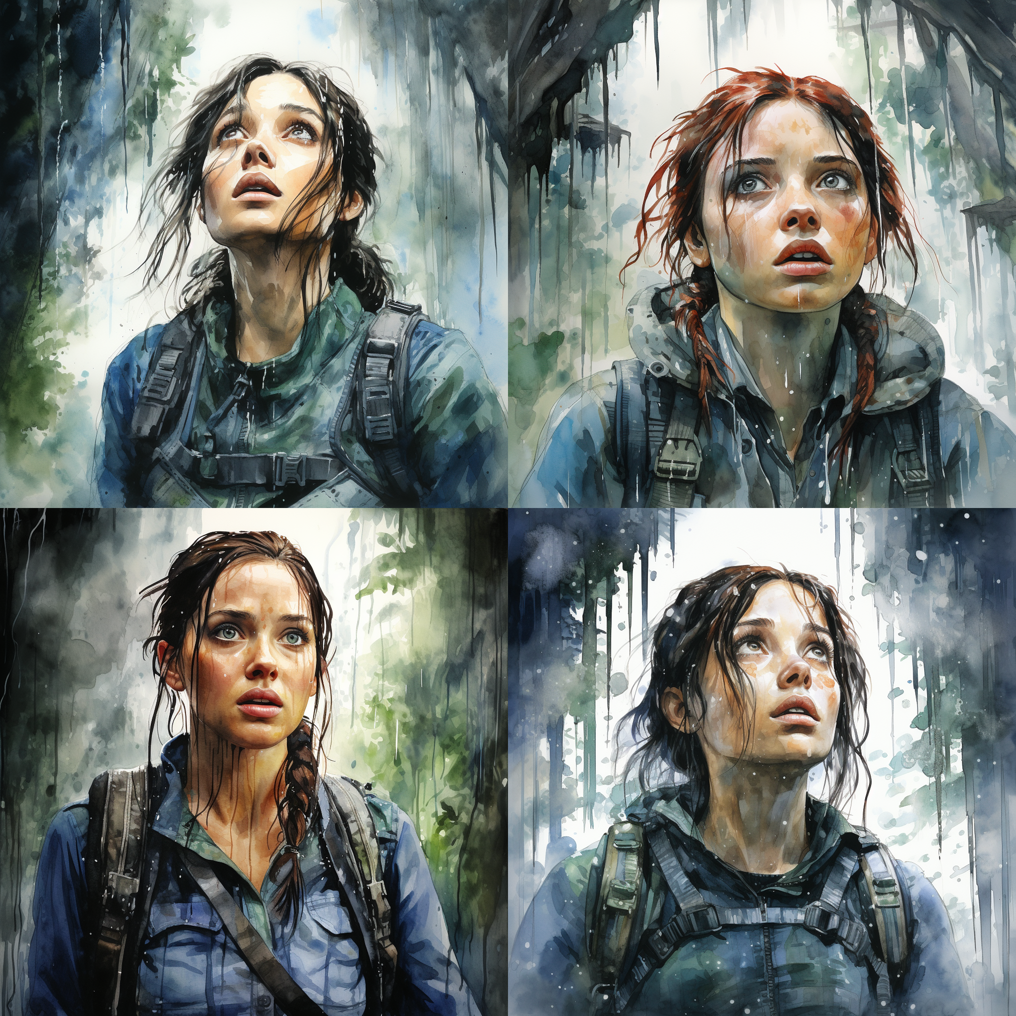 a watercolour painting of a post apocalypse scene of a bedragled womens face and shoulders and hips, who is looking towards the camera, rain is running off her face, droplets of water are on her forehead, she is standing under a waterfall and is covered in rain, the camera is at ground height and we are looking up at the rainforest canopy and the blue grey sky. It is raining very heavily and water is coming off the trees in torrents’, photograph shot on NIKON D810 + 19mm f/4 PC-E @ ISO 3200, 1/13, f/5.6 camera/ 8k –s 250 – <@550873690510721024> (fast)