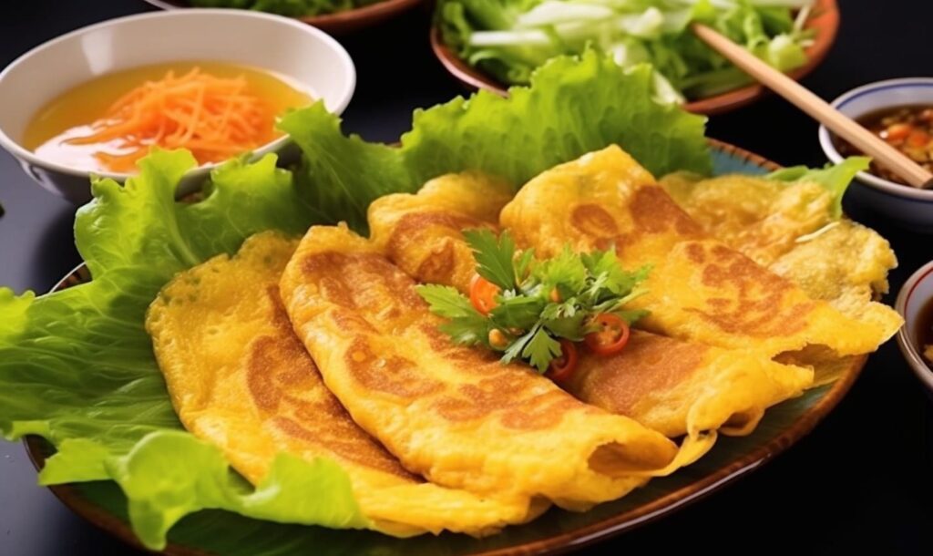 Banh Xeo, Vietnamese crispy pancake, made from rice flour batter infused with turmeric, folded in half, giving it a vibrant yellow color, served with lettuce leaves and herbs for wrapping and dipping into a sweet and tangy fish sauce-based dip, shot by Sony a6400, professional photoshot –ar 5:3
