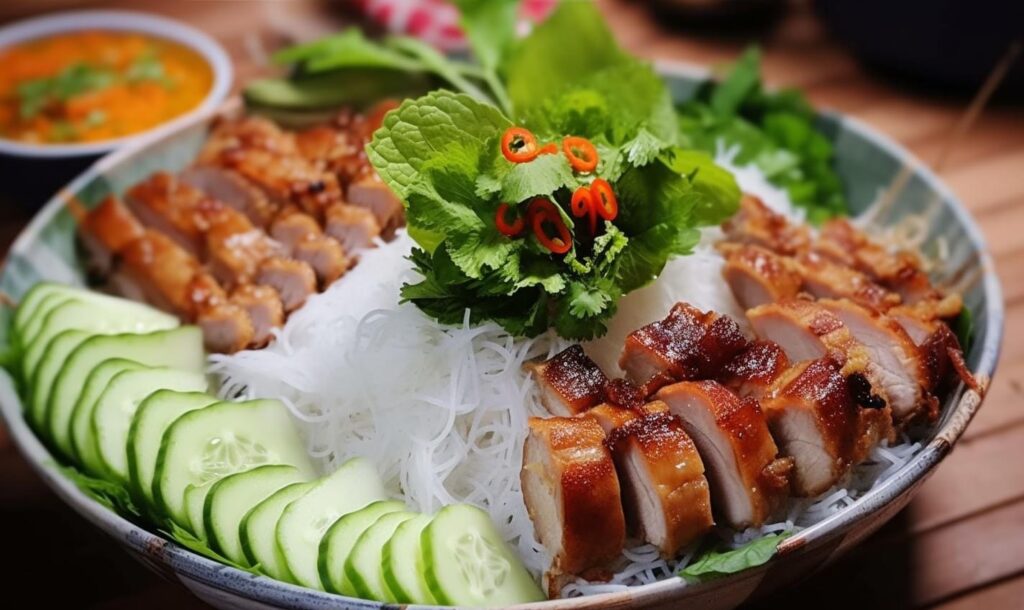 roasted pork and fine rice vermicelli dish, vietnamese food, shot by Sony a6400, professional photoshot –ar 5:3