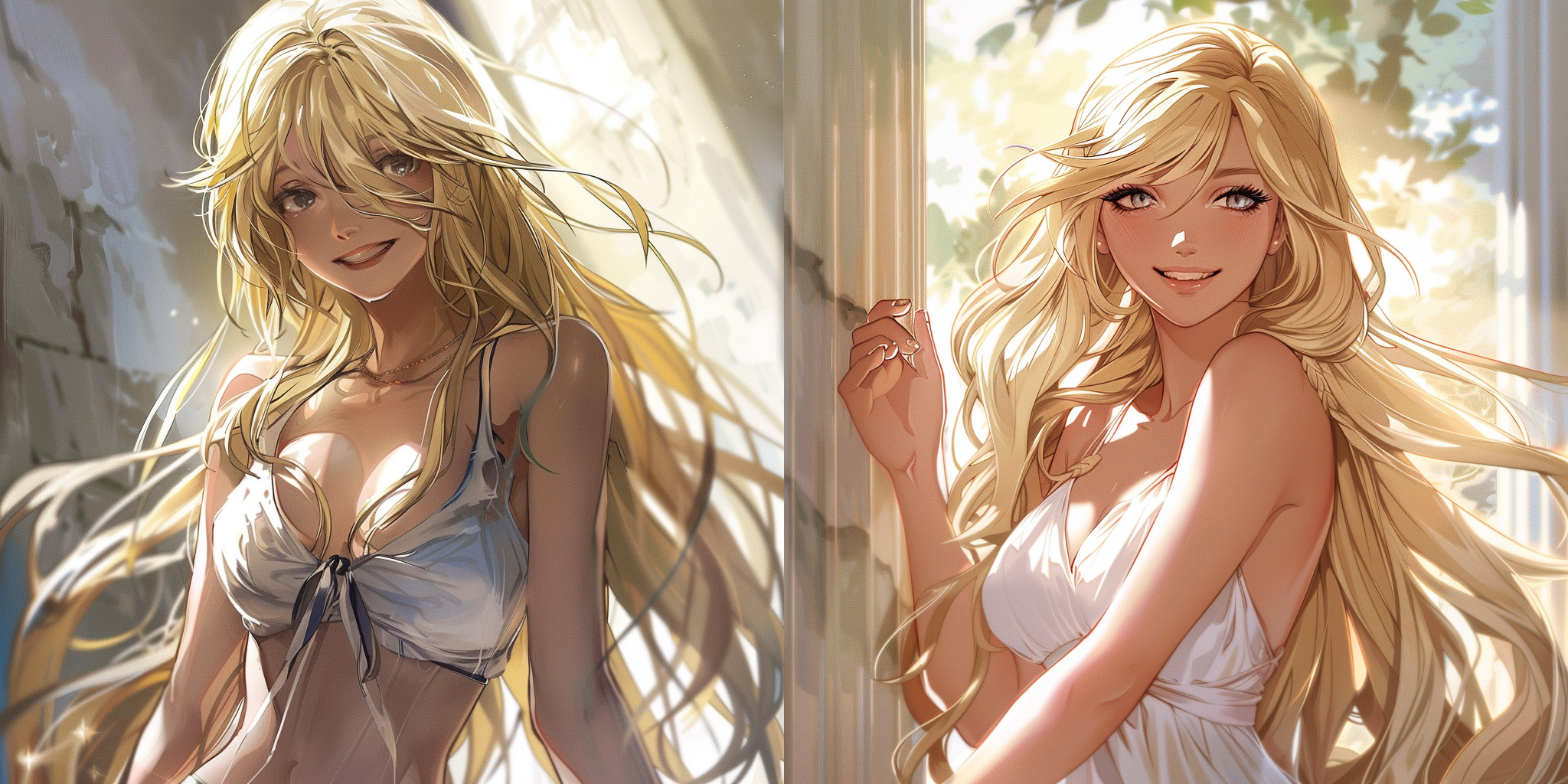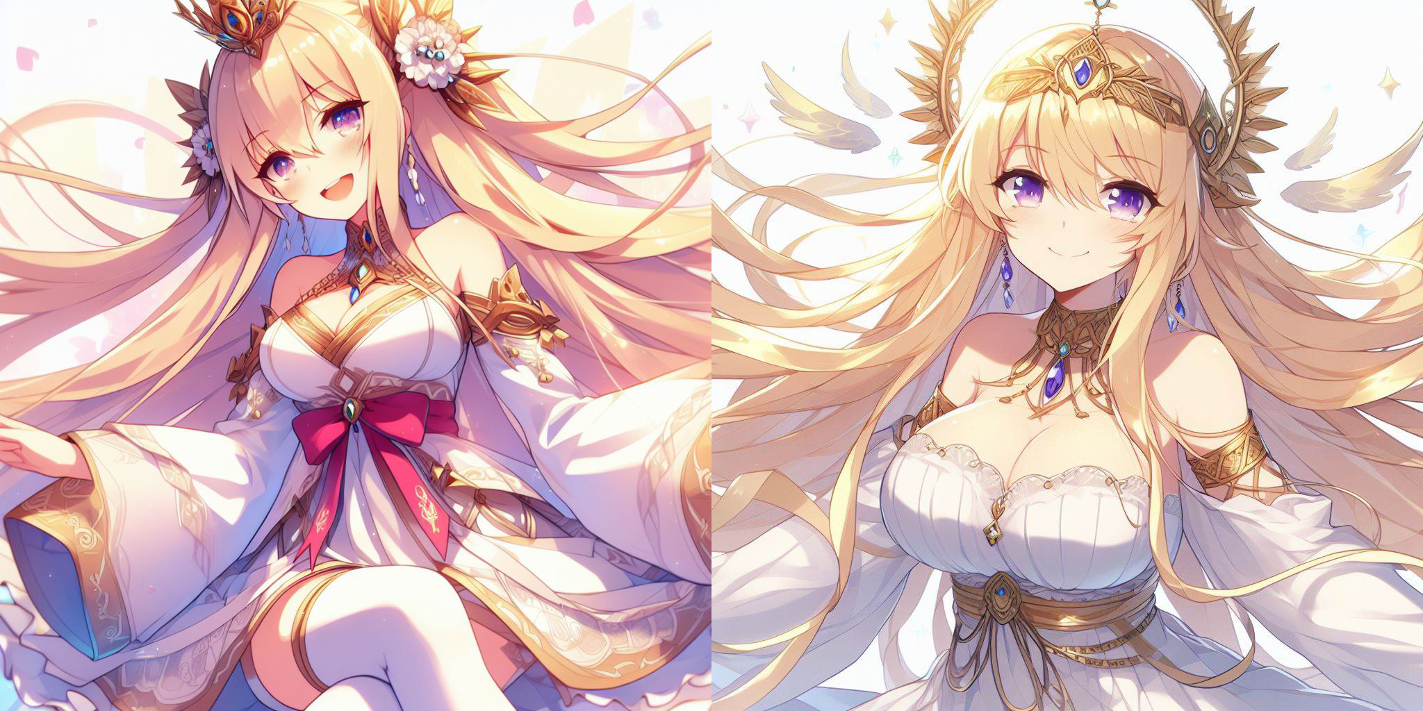 Anime style, blonde long-haired woman, goddess, smiling, full body picture