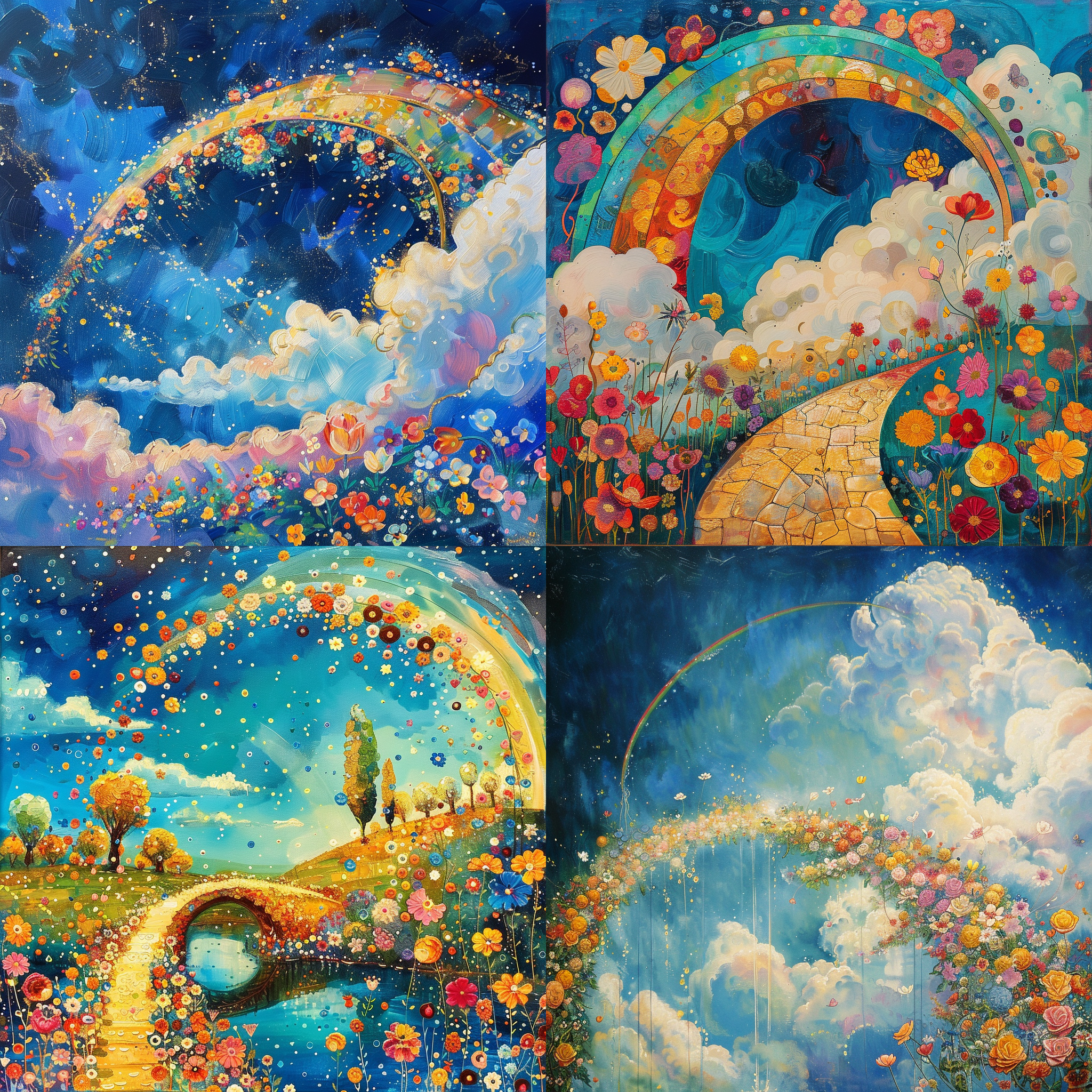 The sky with a beautiful rainbow bridge and beautiful flowers waving, the world of colorful picture books, Klimt style