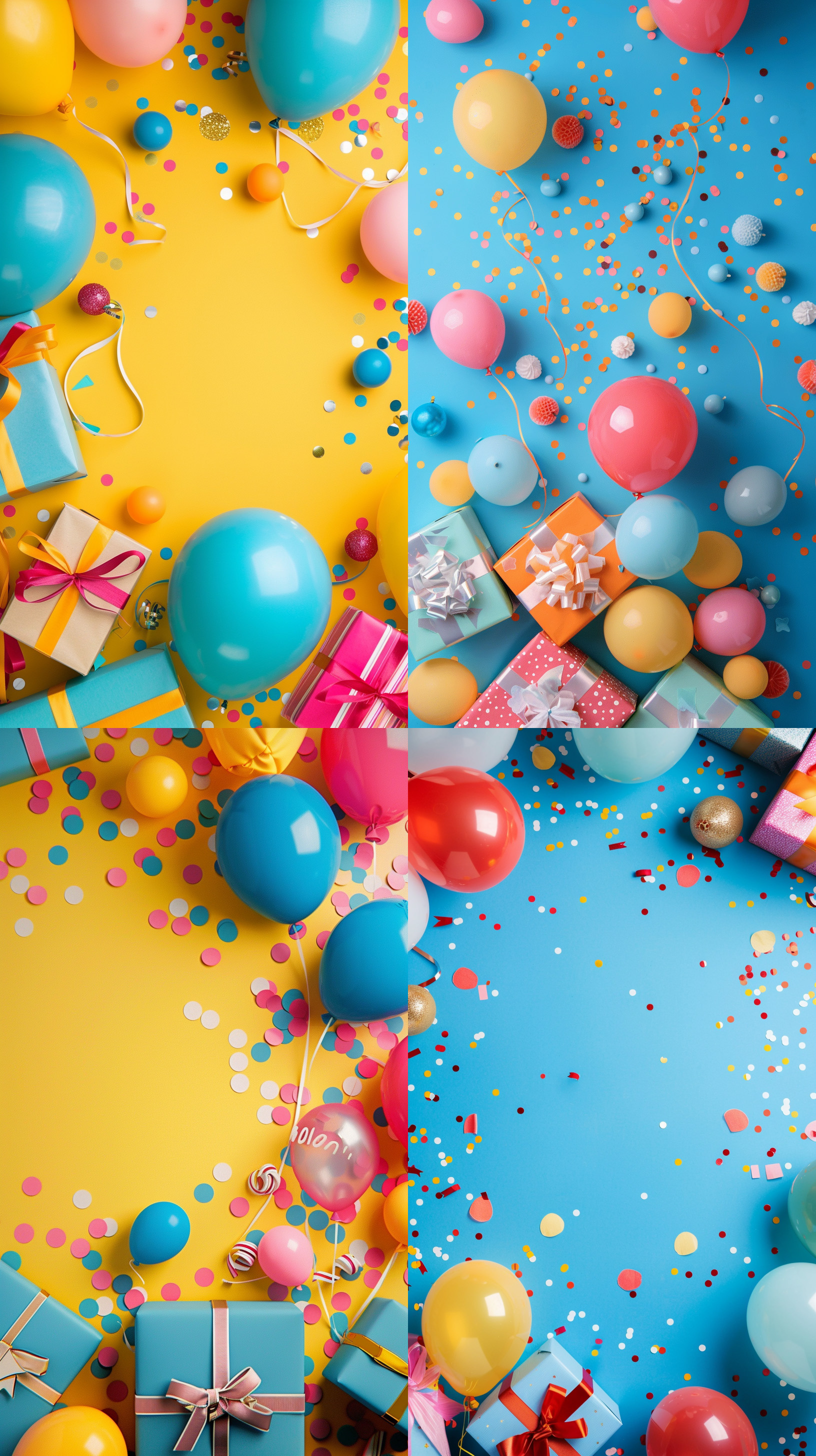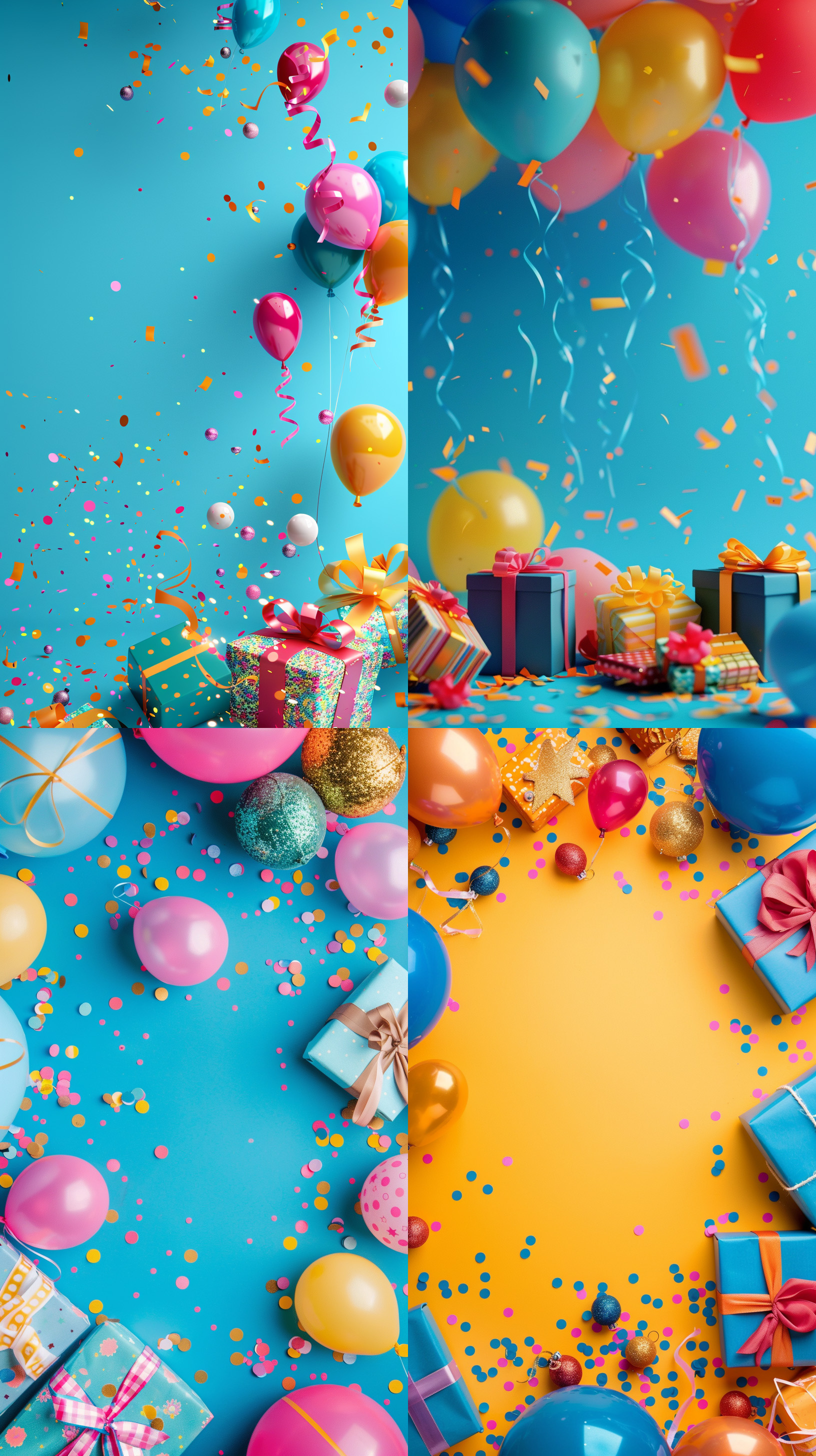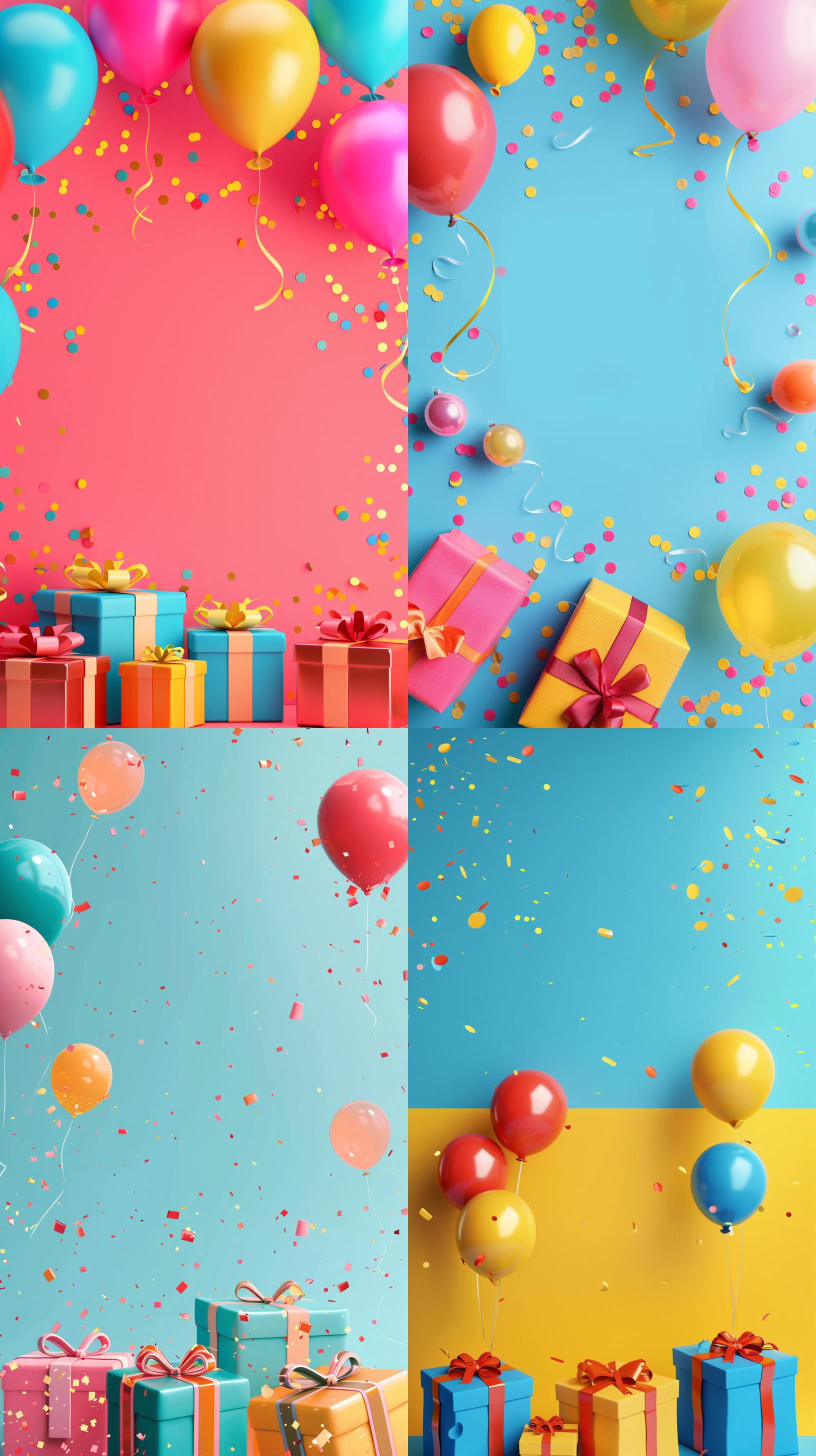 create a festive banner with gifts at the bottom and balloons on the side above, 50% free space for text, bright summer colors, –ar 9:16